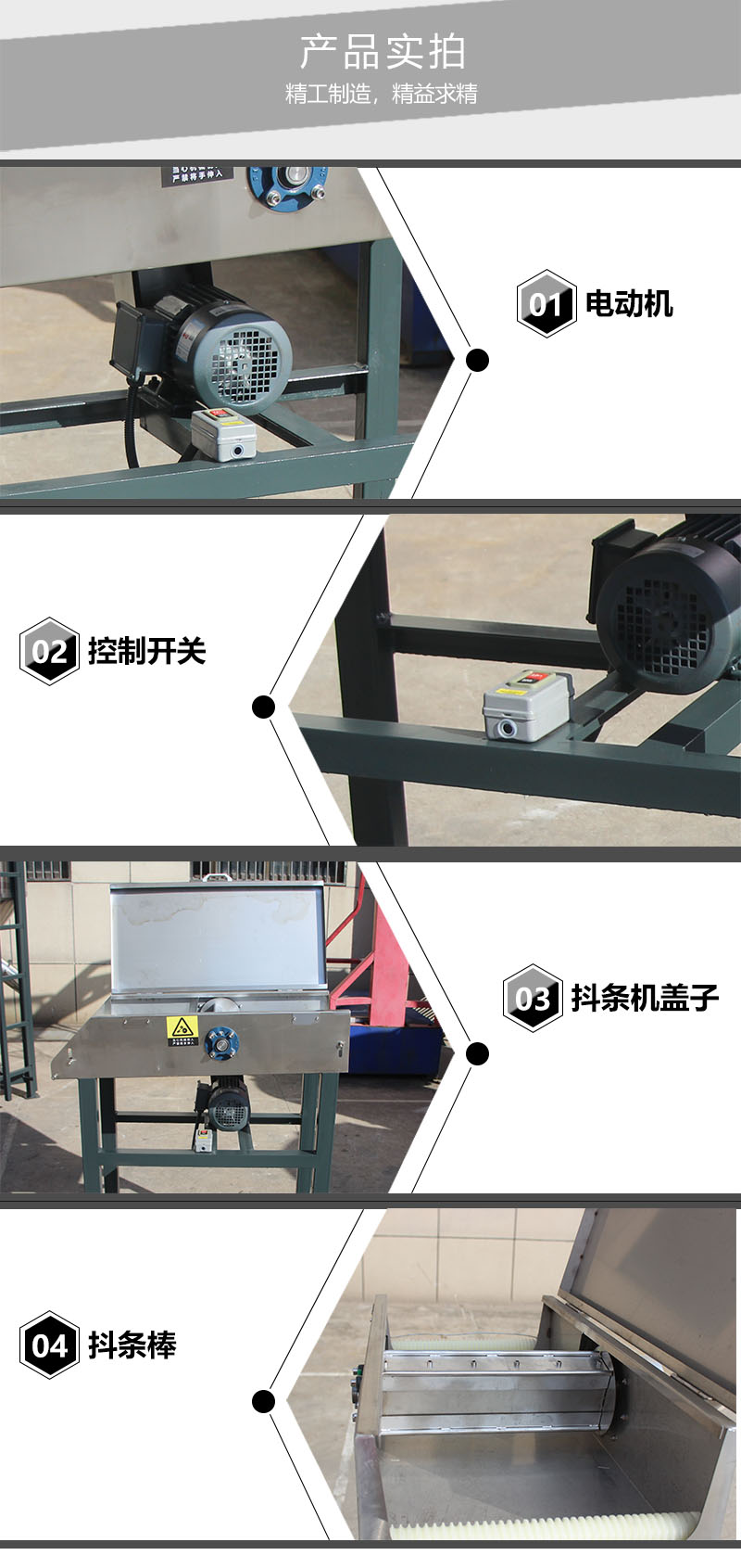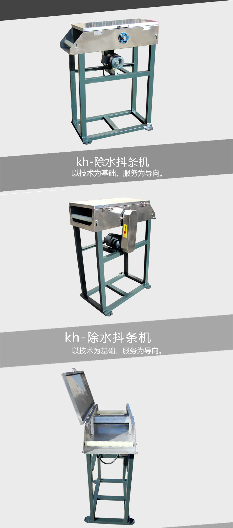 用途:適用于冷卻水槽和立式風機或者切粒機之間的架橋。 特點: 1:塑料拉絲經(jīng)過除水抖條機時,高頻率抖動,除去塑料拉絲表面水分。 2:材質為不銹鋼,使用壽命長。